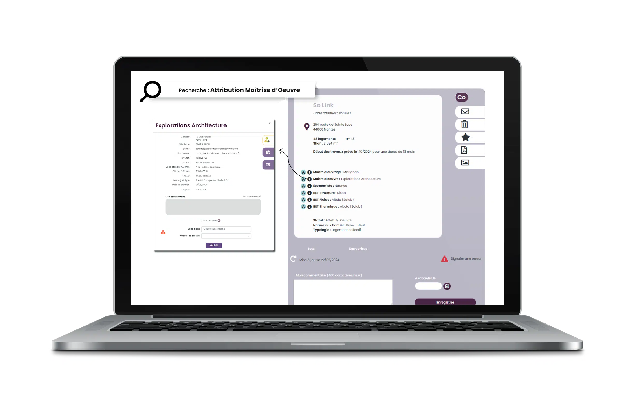 Sur notre solution, ils peuvent trouver les chantiers dont la maîtrise d’oeuvre vient d’être désignée et obtenir leurs coordonnées pour les contacter. Étant en pleine rédaction du cahier des charges, DCE, CCTP, c’est le moment opportun pour présenter leurs produits et les faire inscrire comme référence dans les documents techniques. Enfin, nous mettons à disposition des fonctionnalités permettant de baliser les actions déjà réalisées afin d’assurer un suivi (comme dans un CRM).