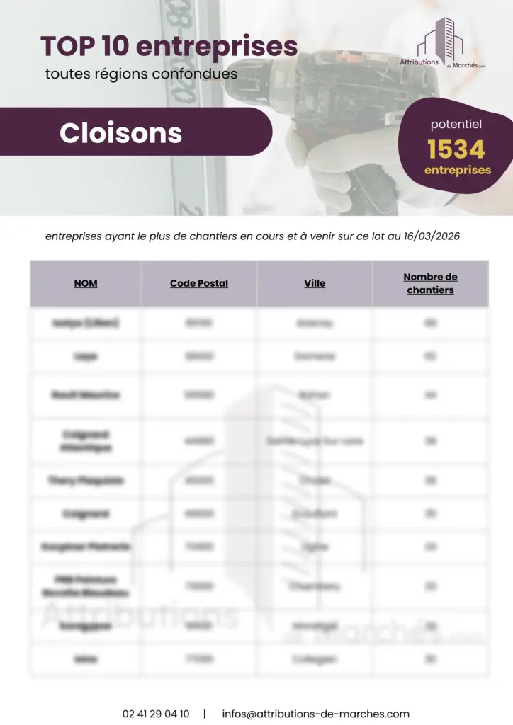En libre téléchargement, obtenez un TOP 10 des entreprises ayant le plus de chantiers en cours et à venir sur le lot CLOISONS sur la France métropolitaine (chantiers BTP issus de notre base de données, c’est-à-dire d’au moins 1 million d’euros en TCE).