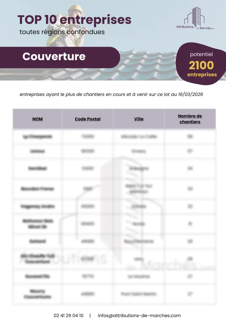 En libre téléchargement, obtenez un TOP 10 des entreprises ayant le plus de chantiers en cours et à venir sur le lot COUVERTURE sur la France métropolitaine (chantiers BTP issus de notre base de données, c’est-à-dire d’au moins 1 million d’euros en TCE).