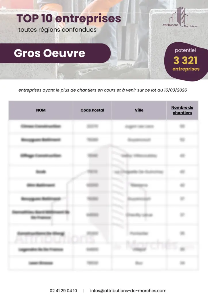 En libre téléchargement, obtenez un TOP 10 des entreprises ayant le plus de chantiers en cours et à venir sur le lot GROS OEUVRE sur la France métropolitaine (chantiers BTP issus de notre base de données, c’est-à-dire d’au moins 1 million d’euros en TCE).