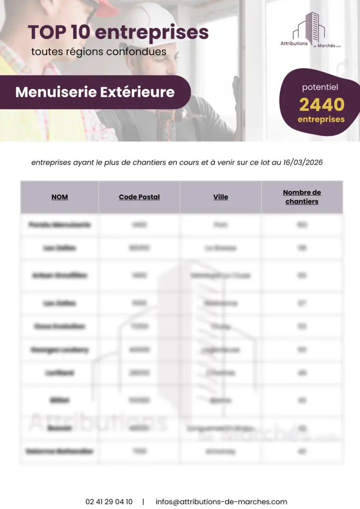 En libre téléchargement, obtenez un TOP 10 des entreprises ayant le plus de chantiers en cours et à venir sur le lot MENUISERIE EXTÉRIEURE sur la France métropolitaine (chantiers BTP issus de notre base de données, c’est-à-dire d’au moins 1 million d’euros en TCE).