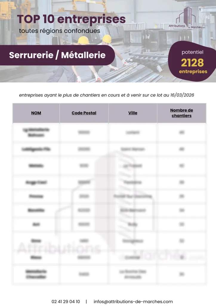 En libre téléchargement, obtenez un TOP 10 des entreprises ayant le plus de chantiers en cours et à venir sur le lot SERRURERIE MÉTALLERIE sur la France métropolitaine (chantiers BTP issus de notre base de données, c’est-à-dire d’au moins 1 million d’euros en TCE).