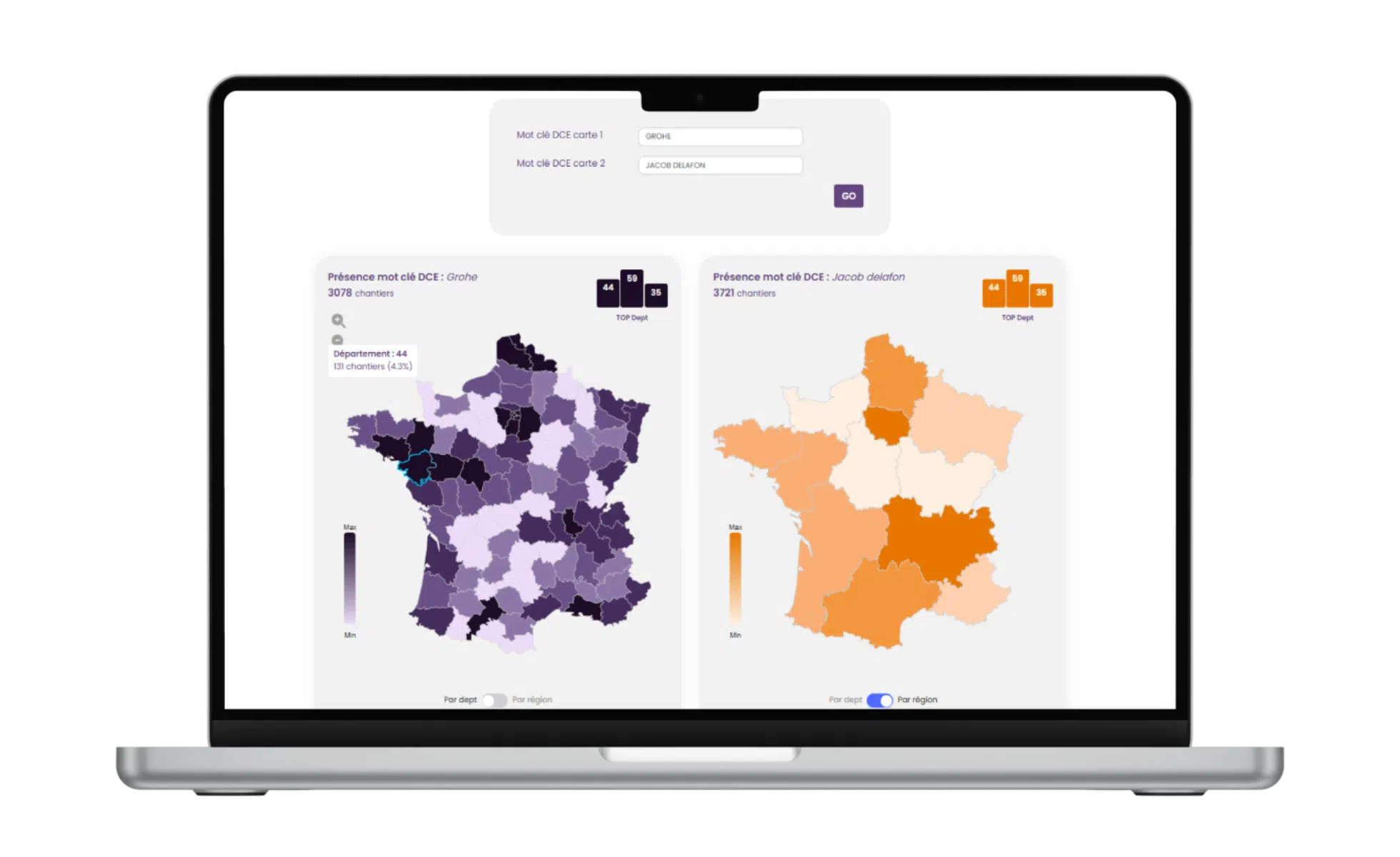 Saisissez votre produit ou marque, comparez-le à un autre comme par exemple celui d’un concurrent. Vous visualisez instantanément la répartition des chantiers où ils sont prescrits, par département ou par région. Cette fonctionnalité vous permet d’Identifiez facilement les territoires à fort potentiel et les acteurs clés qui prescrivent vos solutions pour affiner votre stratégie commerciale.